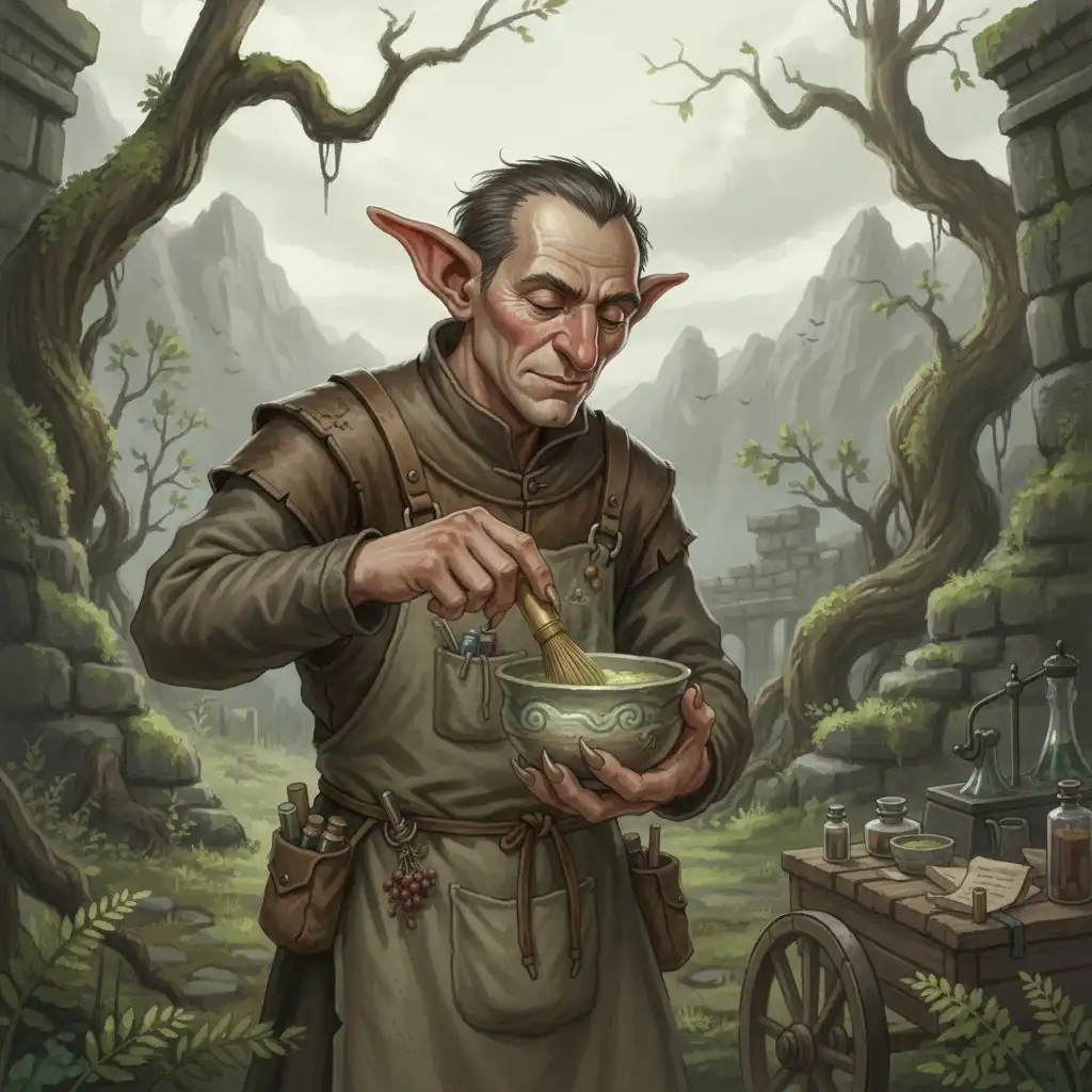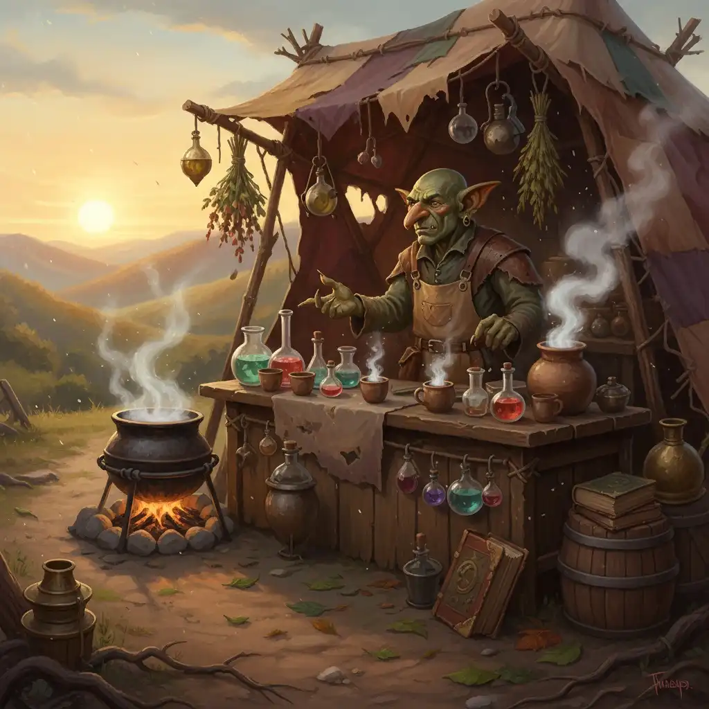 GREEB is a goblin alchemist and street brewer based in Steamroot Market. He specializes in powdered green infusions and support tonics for caravans and patrols. He is loosely tied to the Tea Sages and supplies scouts along the Verdant Steppe.
