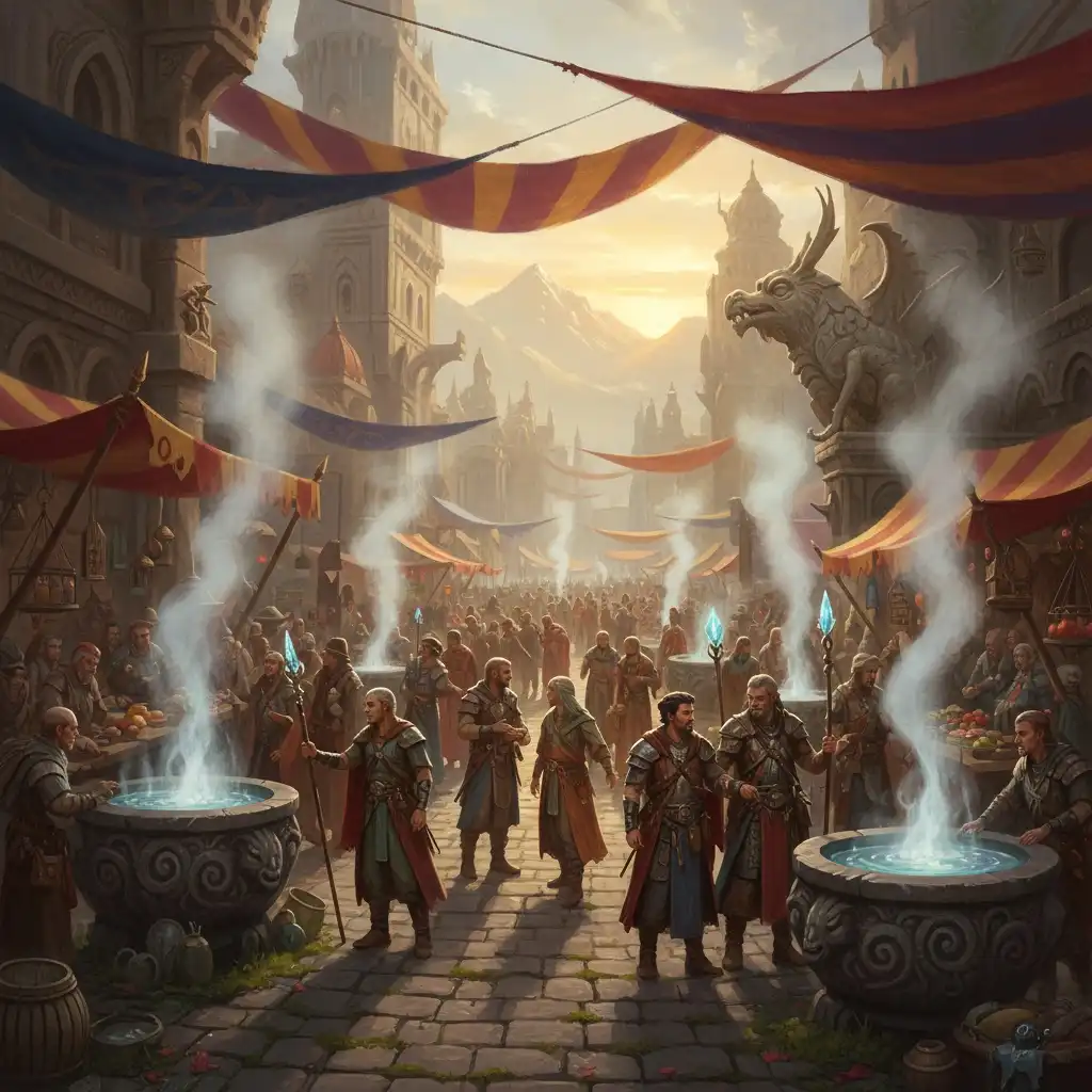 - Spring Plaza: Central stone basins channel mineral vents; shared water rights posted on a brass board.