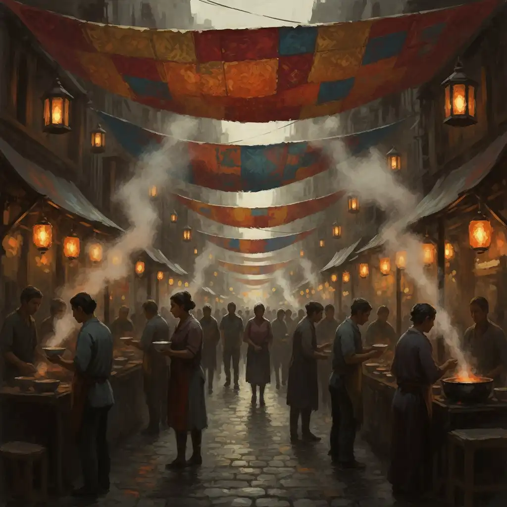 - Copper Canopy: A broad awning of patched sheets over the main trade artery; smoke and steam vent through chimney slits.