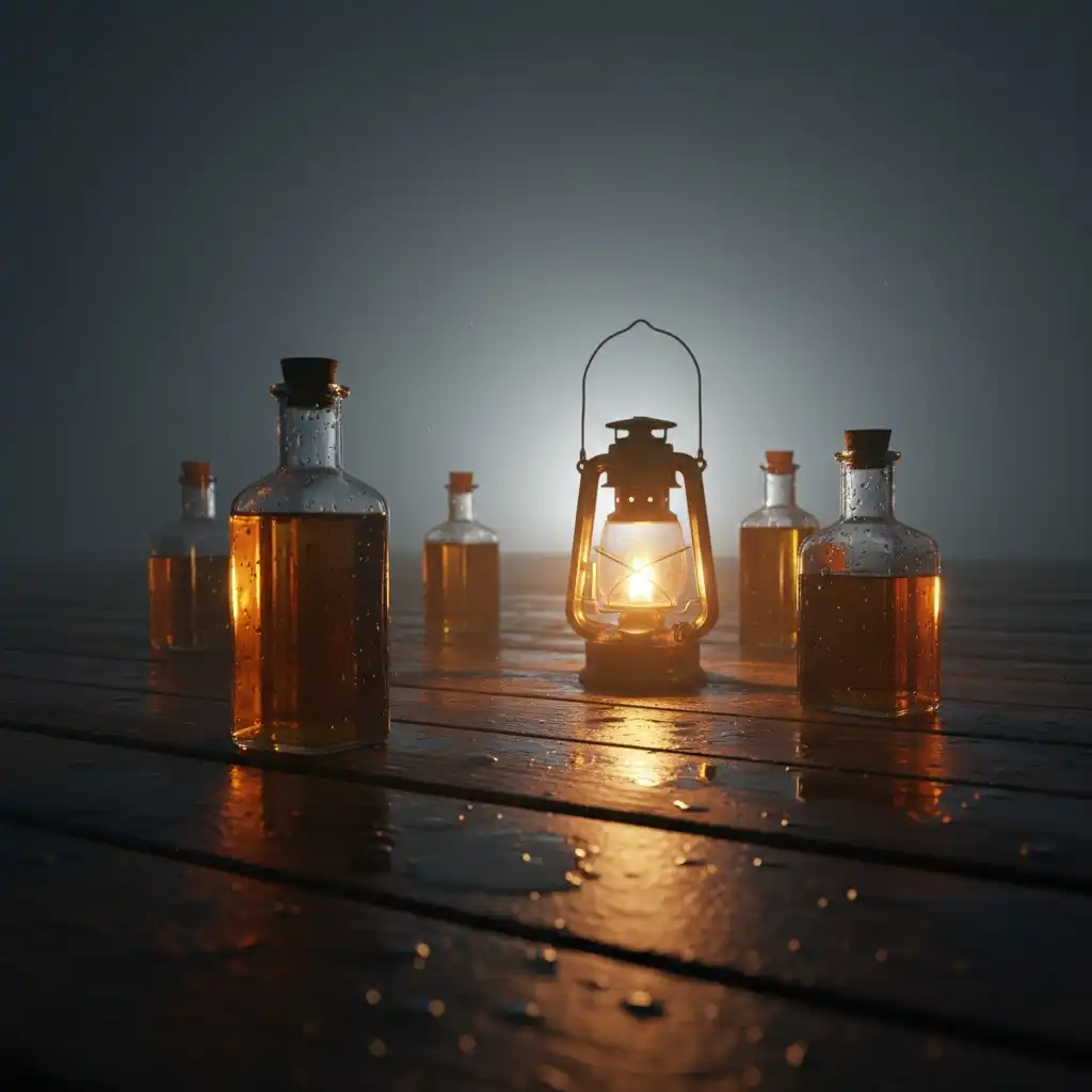 - Packaging: Thick-glass flasks wax-capped for skiff use; tin liter cans for pier lamps; embossed fill marks for rationing.
