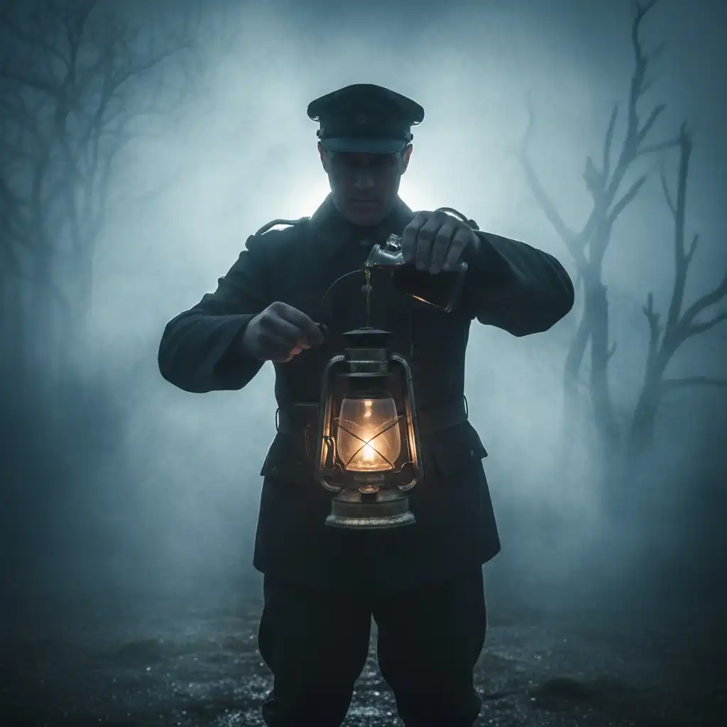 A harbor warden topping a patrol lamp before a fog sweep