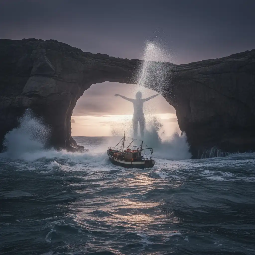 A lone skiff fleeing the arches as the apparition coils in the surf