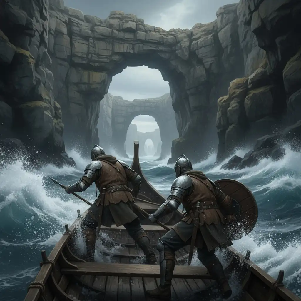 Skiff escort at the Slickstone Arches in rough mist