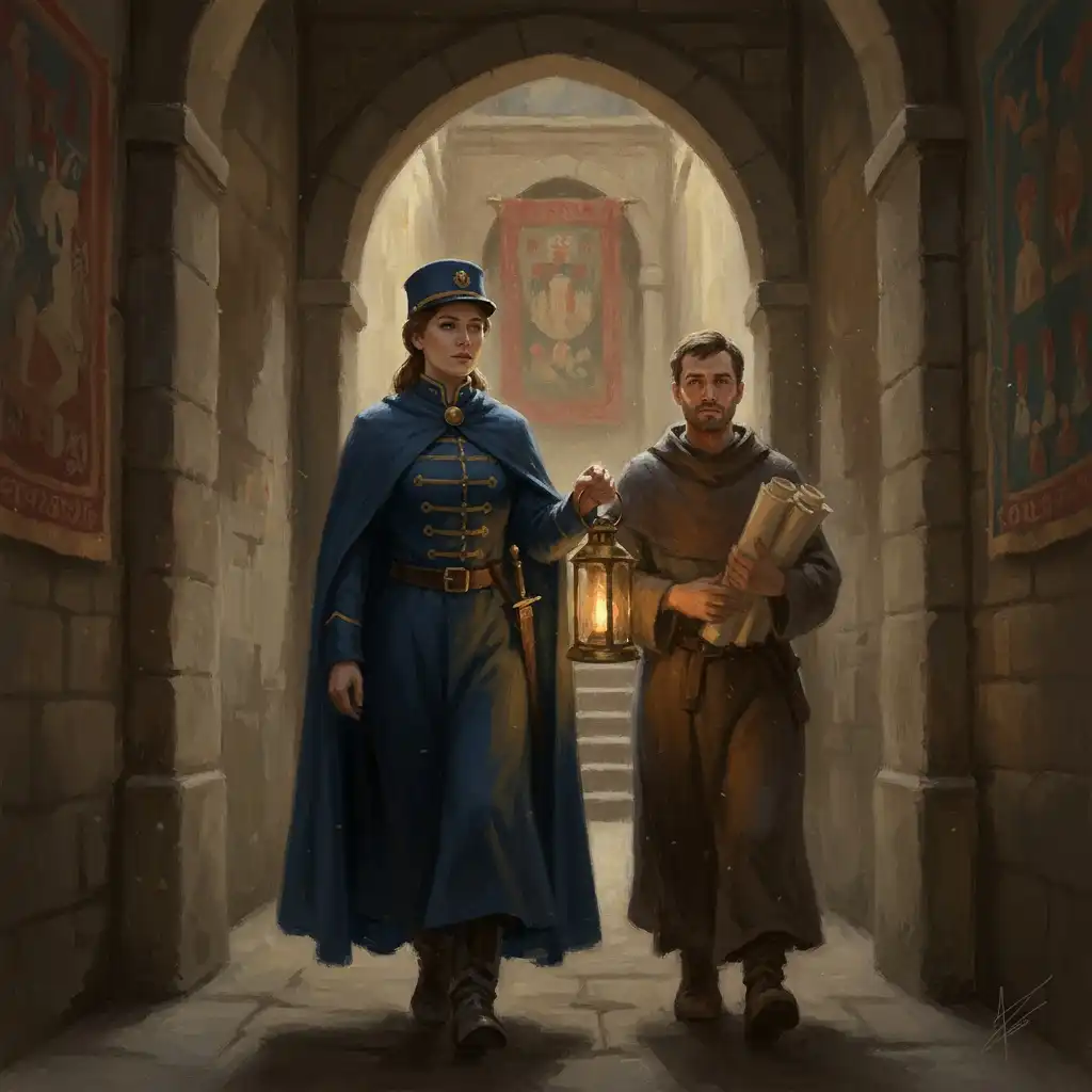 - Uniform: salt-dark coats with badge tabs, brass latch belt, and lantern hook; boots scored for wet stone.
