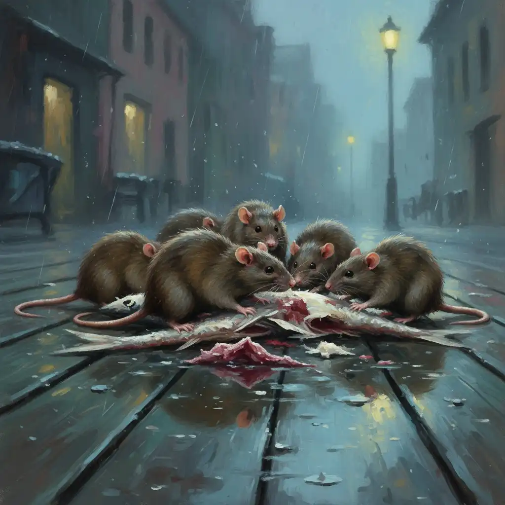 - Sleek, salt-matted fur; tails scarred by barnacle scrapes and trap wires.