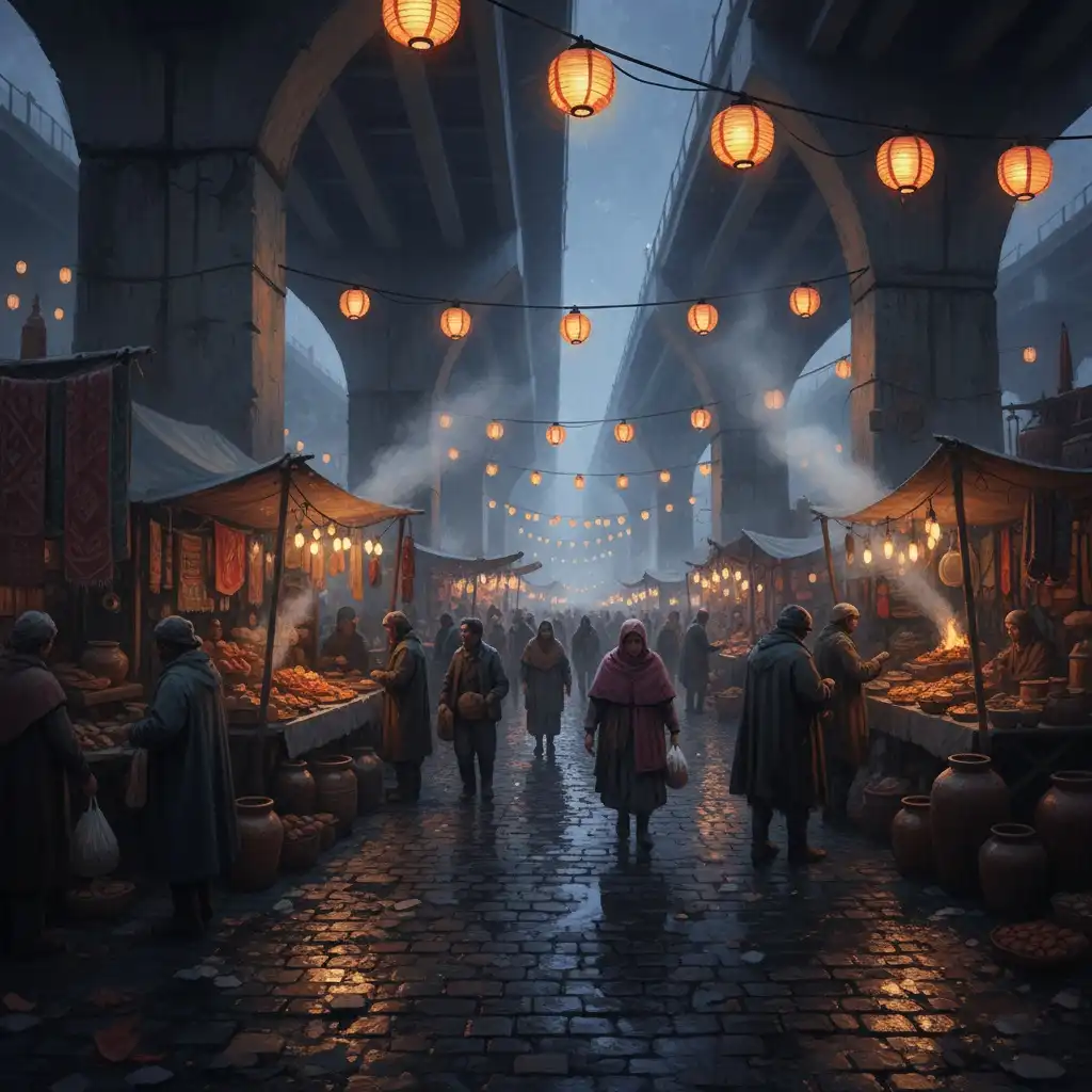 - Underbridge Lanes: Narrow walkways beneath iron spans; tarps, drip pans, and rope lights hide stall fronts.